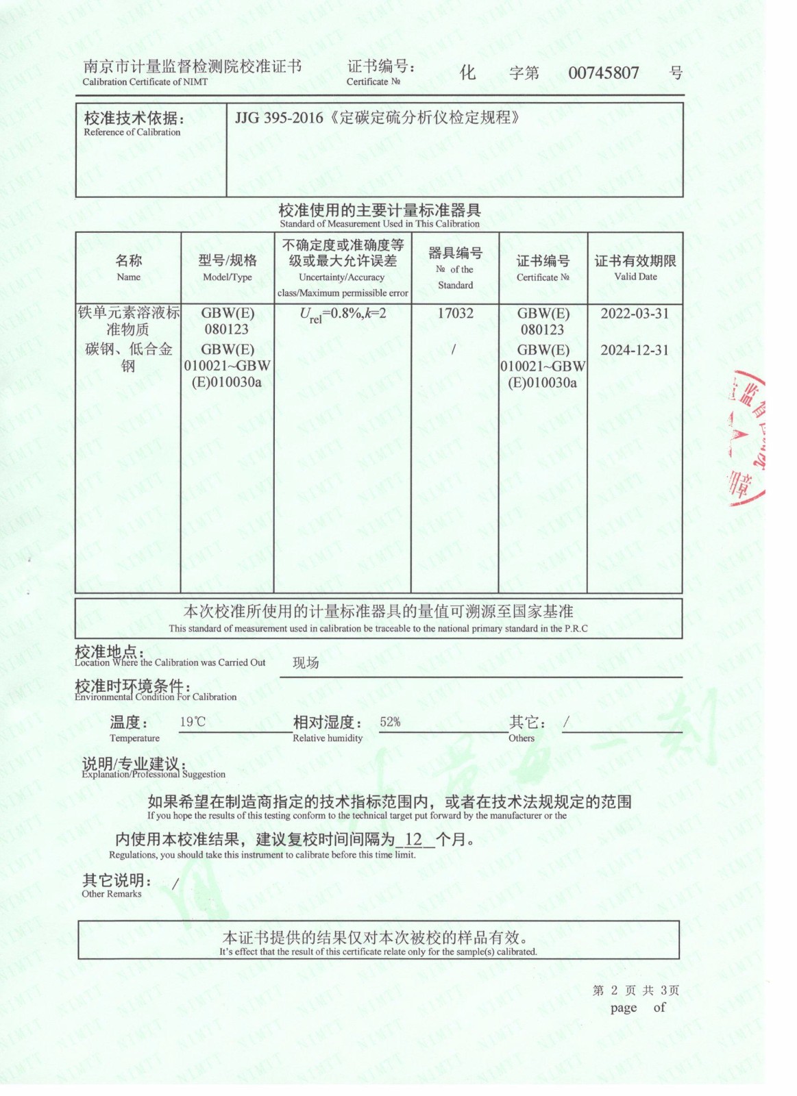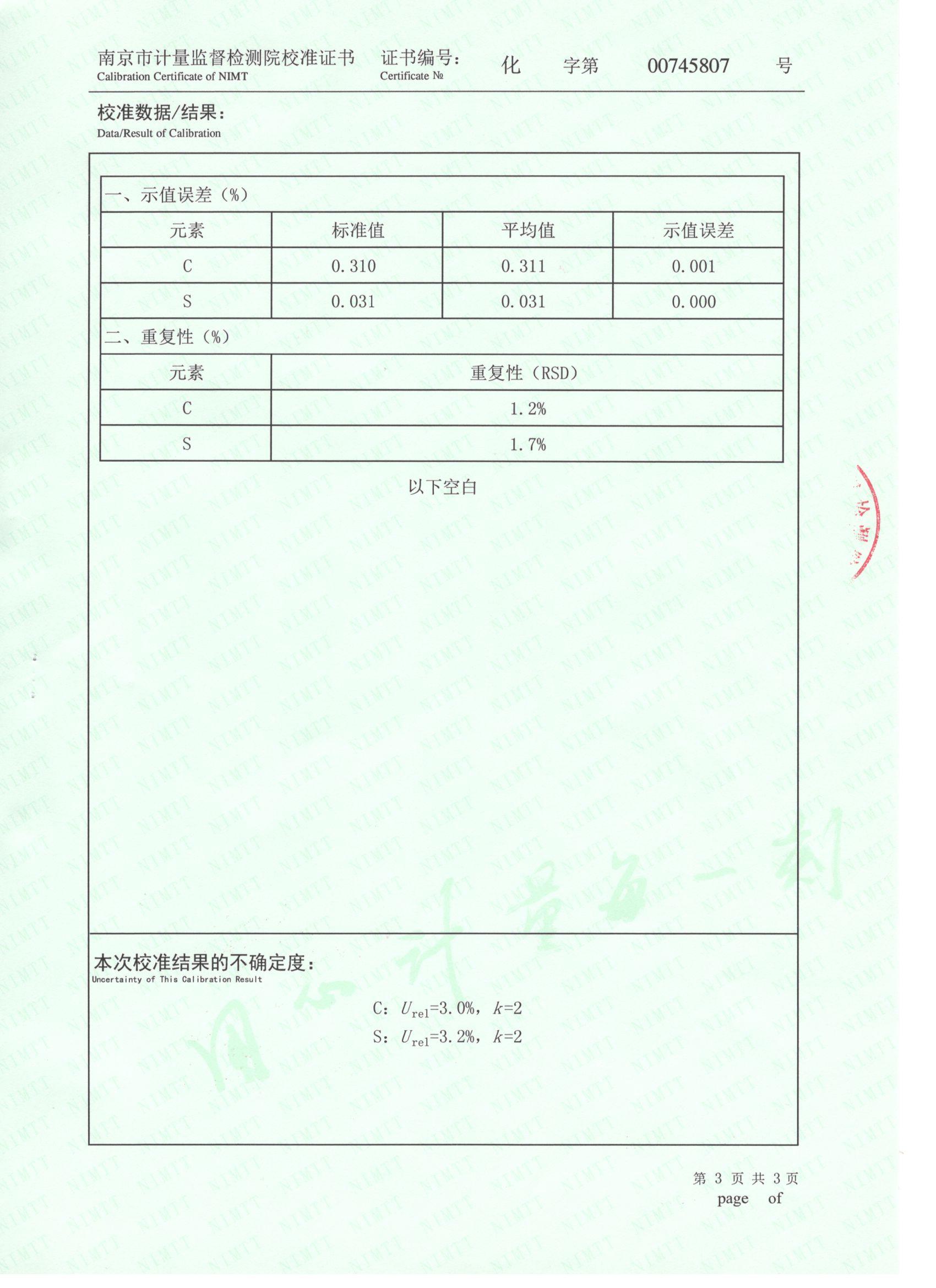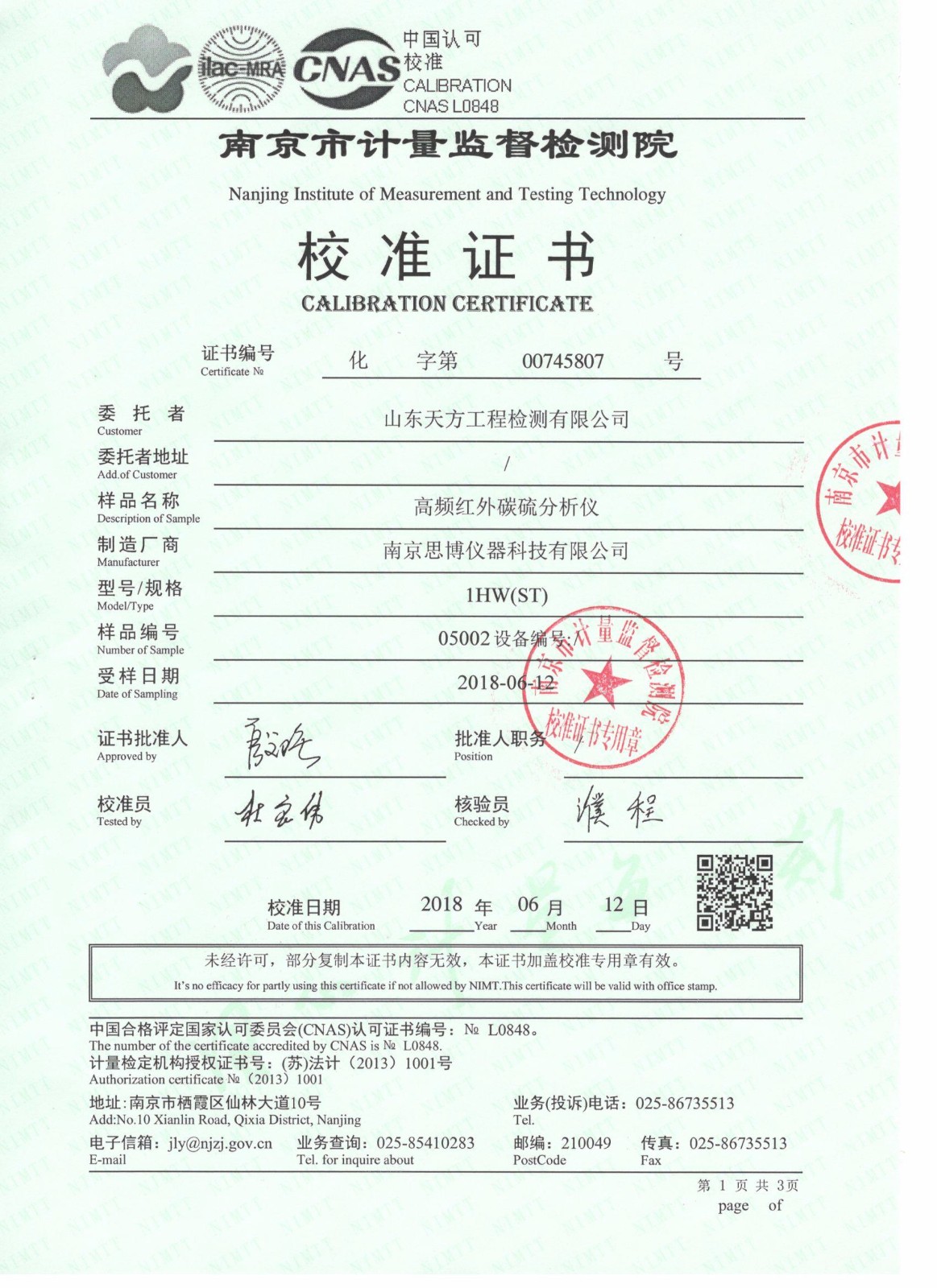 高頻紅外碳硫分析儀榮獲南京市計(jì)量監(jiān)督檢測(cè)院校準(zhǔn)證書